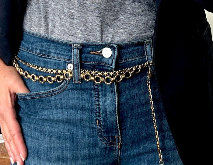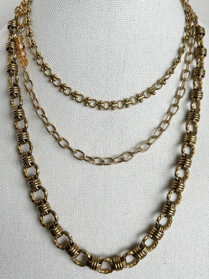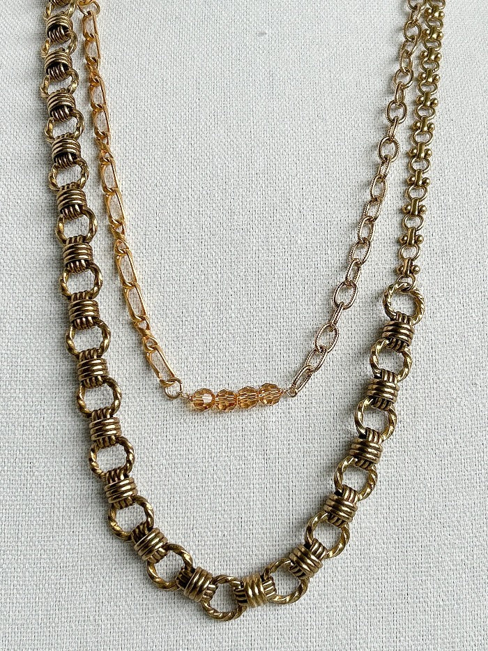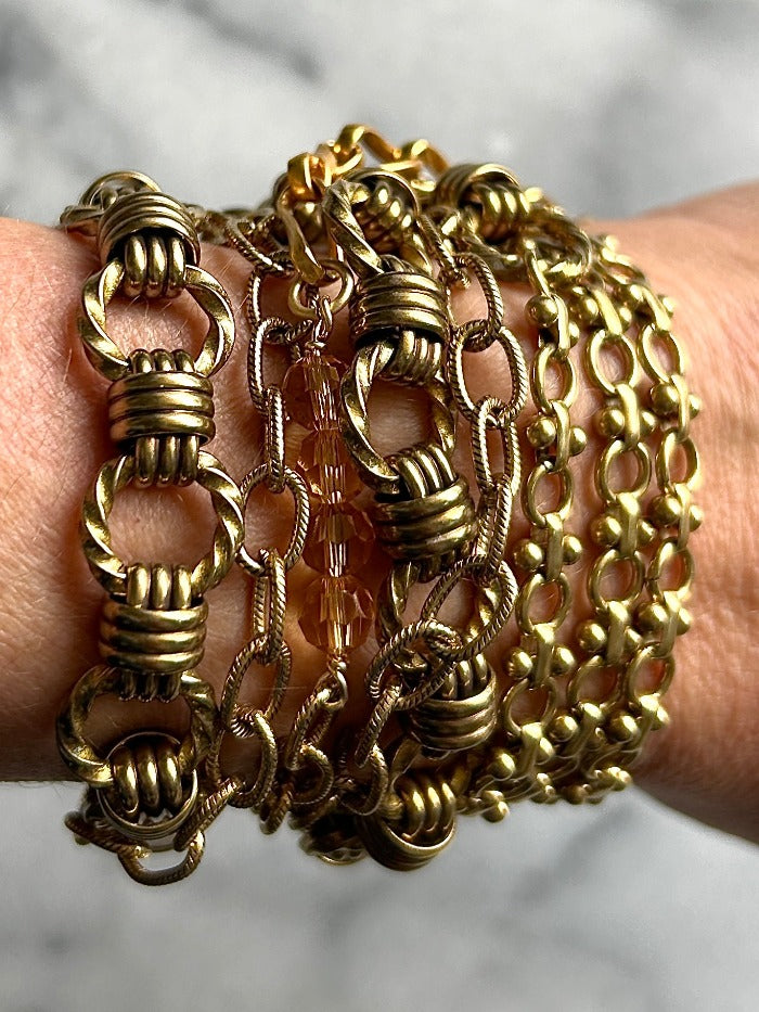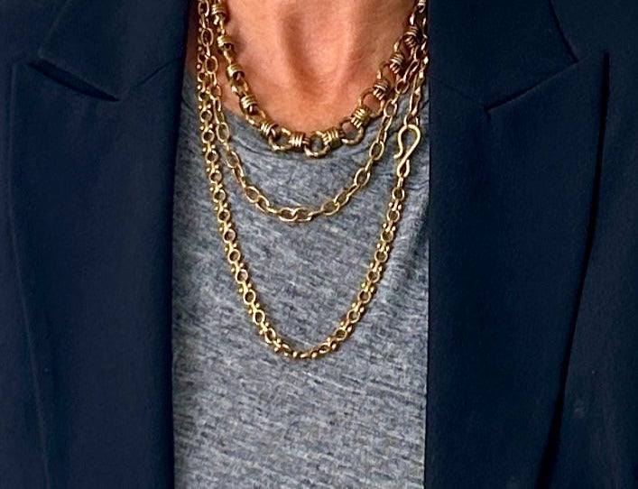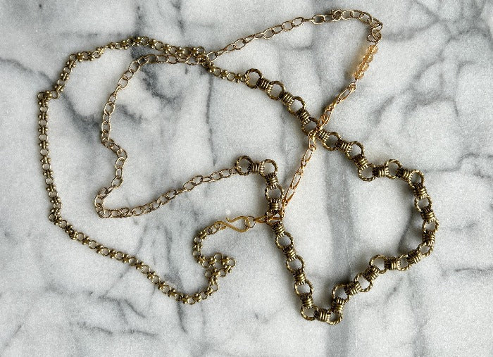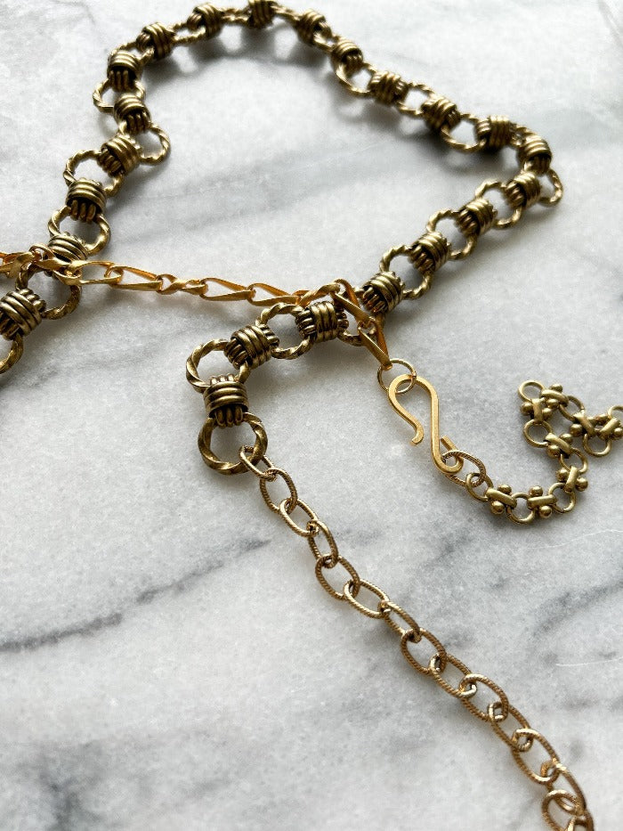 A collection of handpicked chains combined to create a long necklace that wraps up to three times. The clasp is arranged so you can wear it as a bracelet, belt, or cross-body under your favorite blazer. You get to decide.