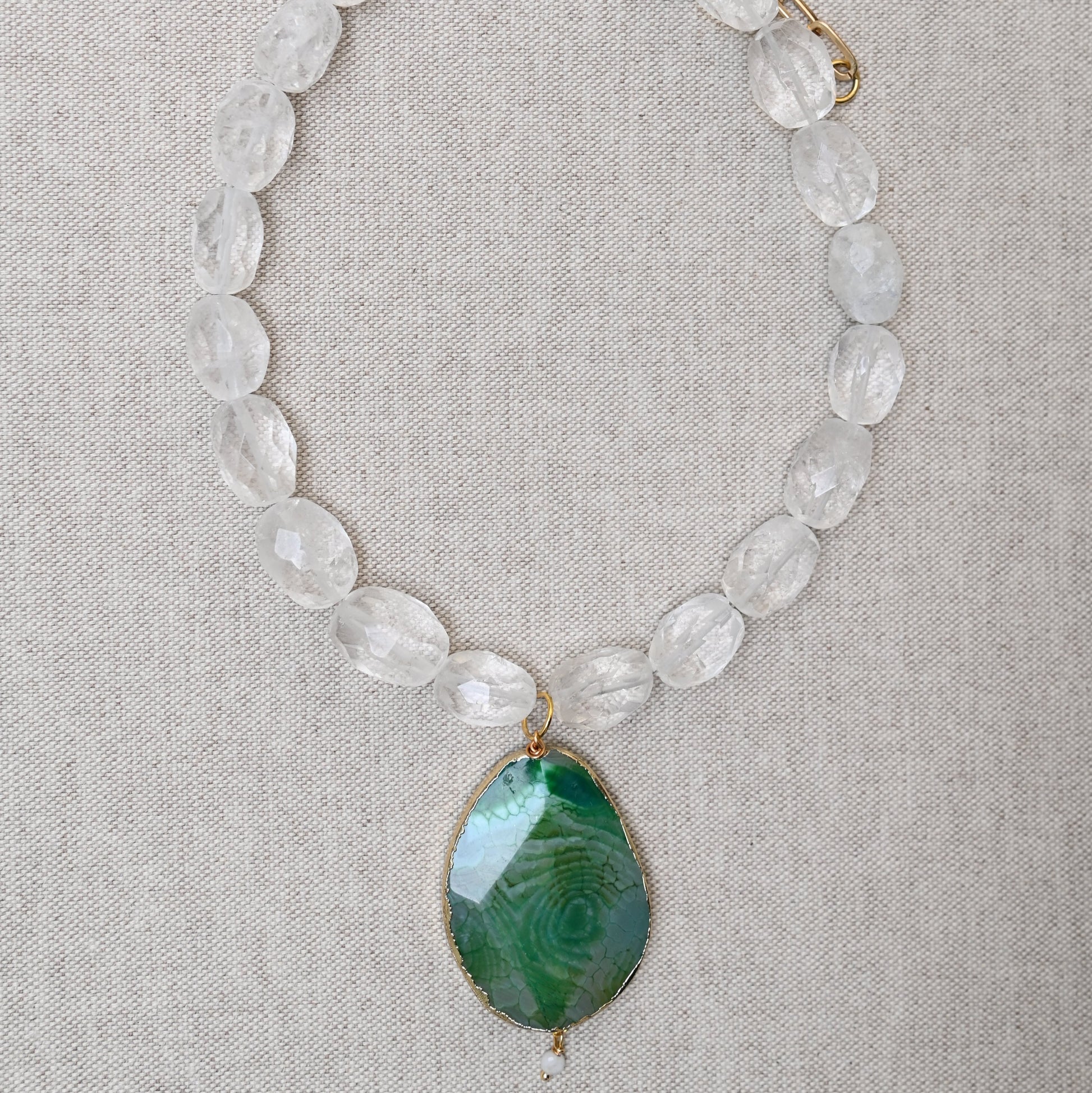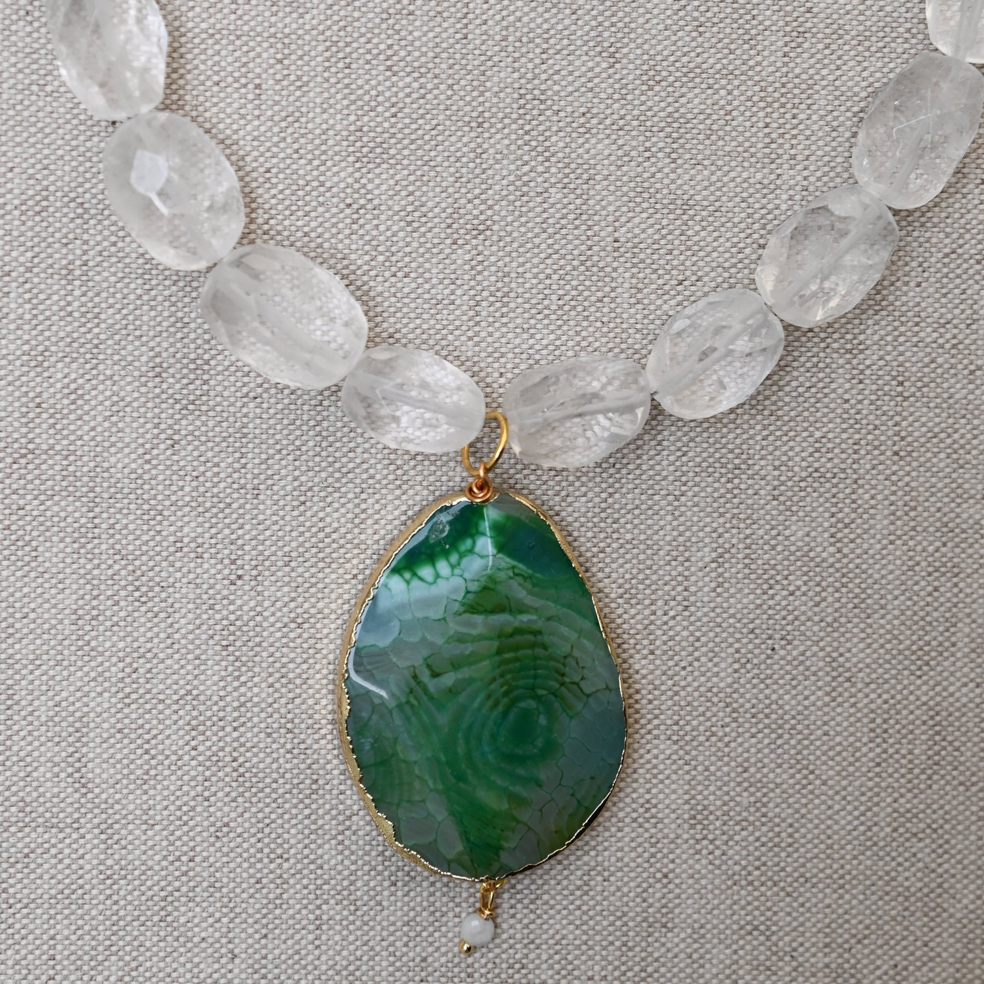 A large Malachite oval pendant hangs from a luxurious crystal quartz strand. Stunning as a statement piece, whether at a cafe in Paris or dining oceanside.