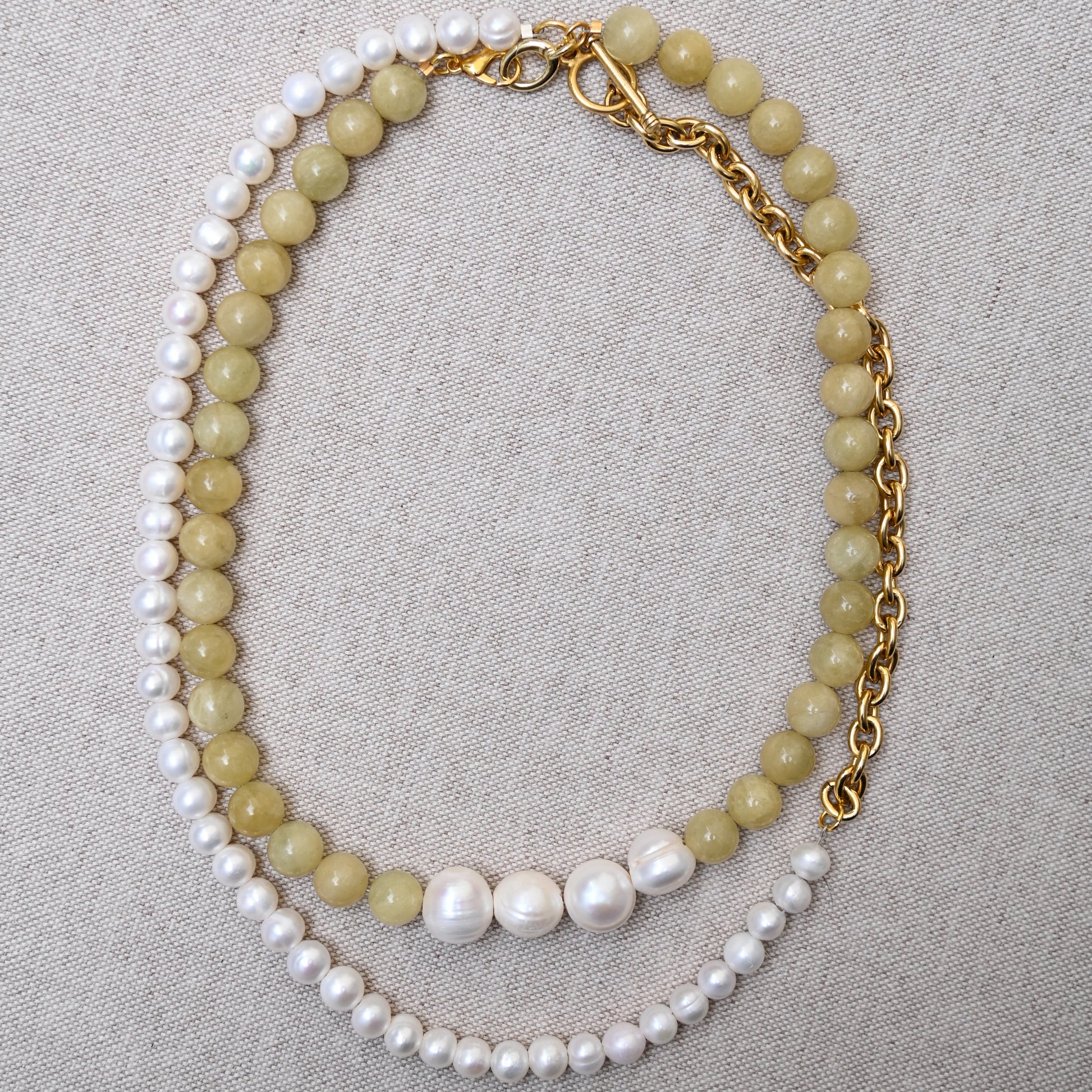 Heliodor Gemstone and freshwater pearls. Derived from the Greek meaning "gift from the sun". A fantastic color that plays well as a neutral but adds something original, whether worn alone or layered. Freshwater pearls can be worn centered or off to the side.