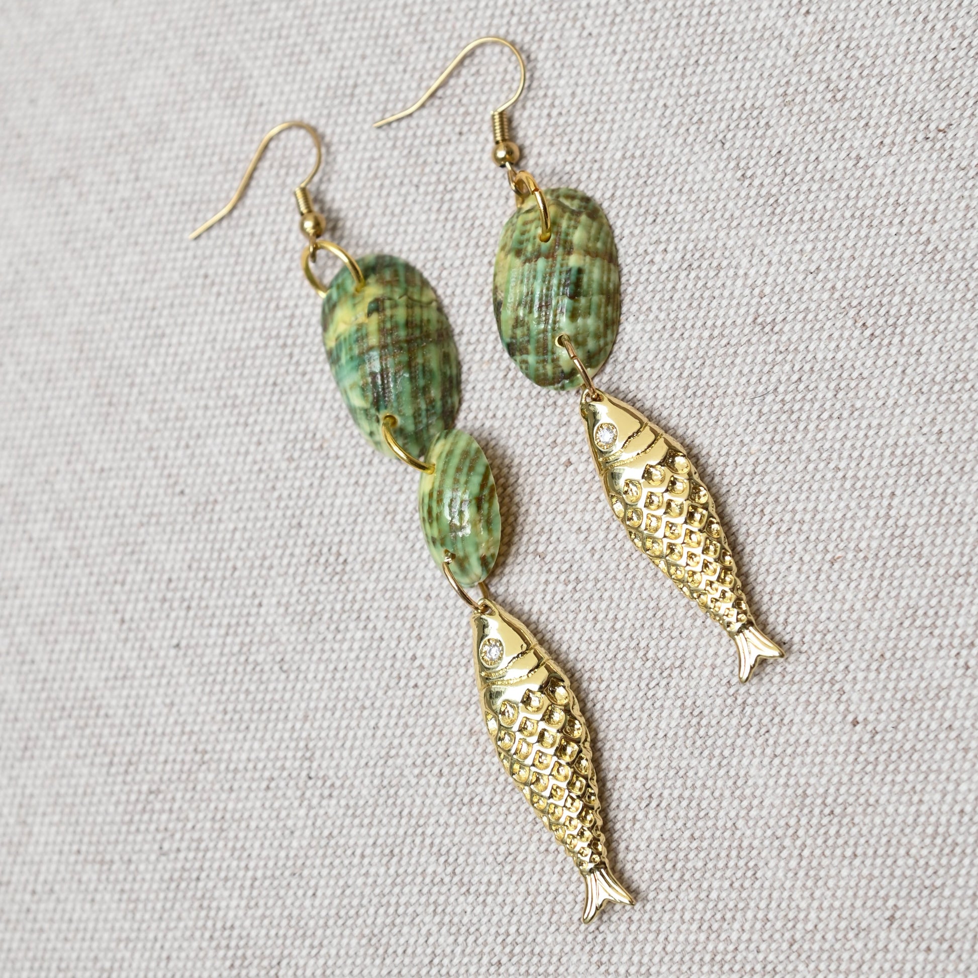 Pescare "fish" in Italian. These hand-picked shells and gold overlay fish charms would look right at home on the Isle of Capri, sitting oceanside with your favorite aperitif in hand.