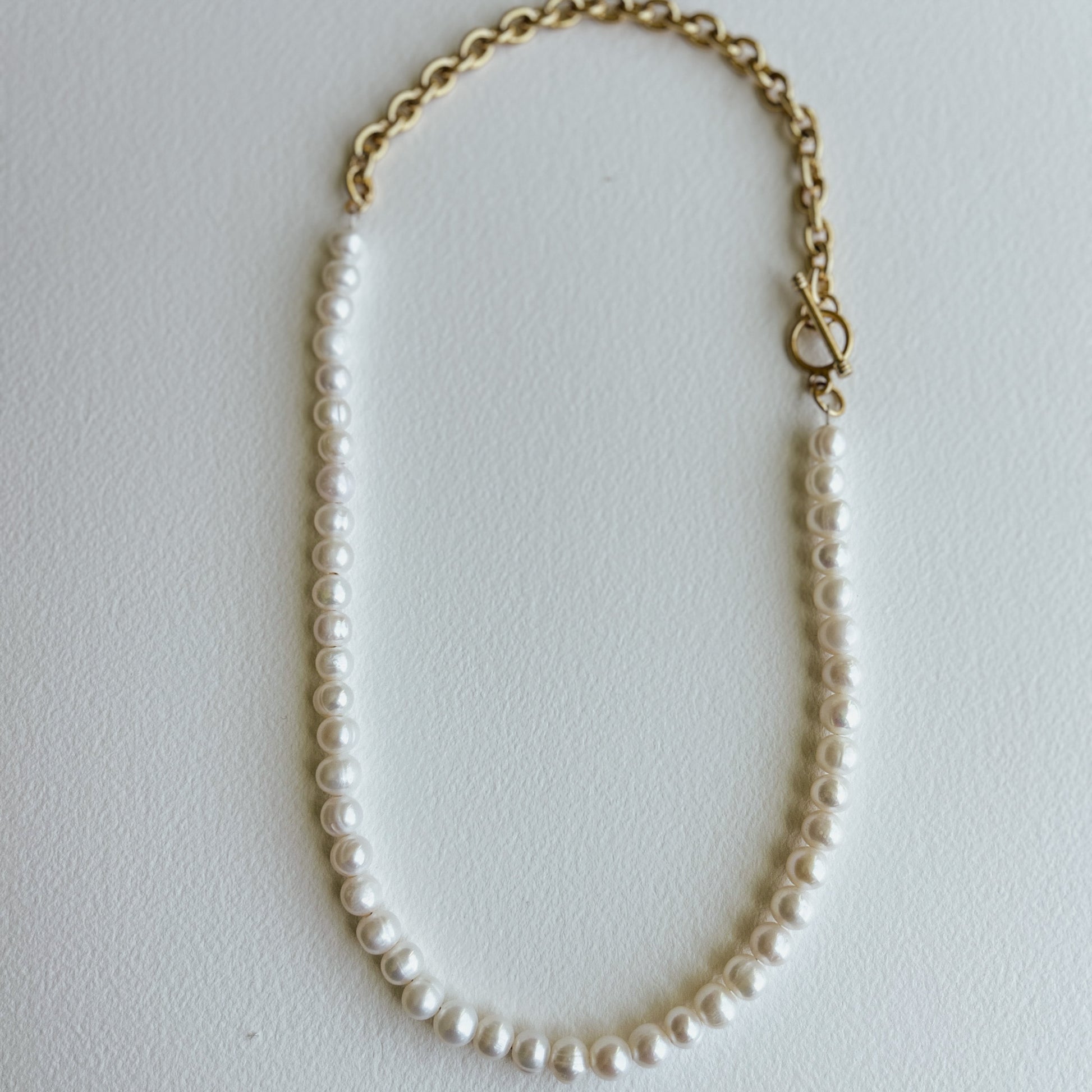 A lovely strand of freshwater pearls with a 14K gold-filled chain and toggle. Wear it alone or layer it with your favorite summer strands. It can be worn with a chain and clasp or pearls in the front.