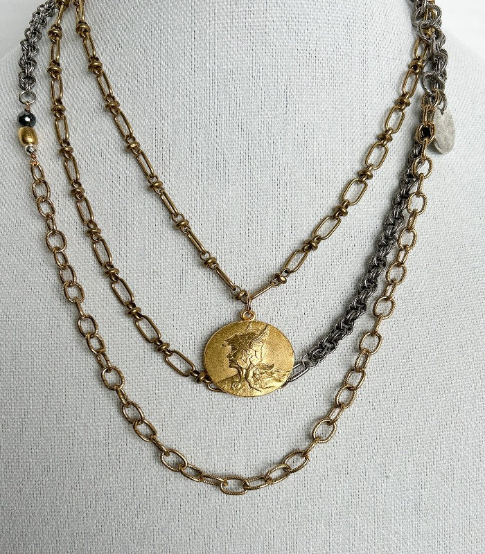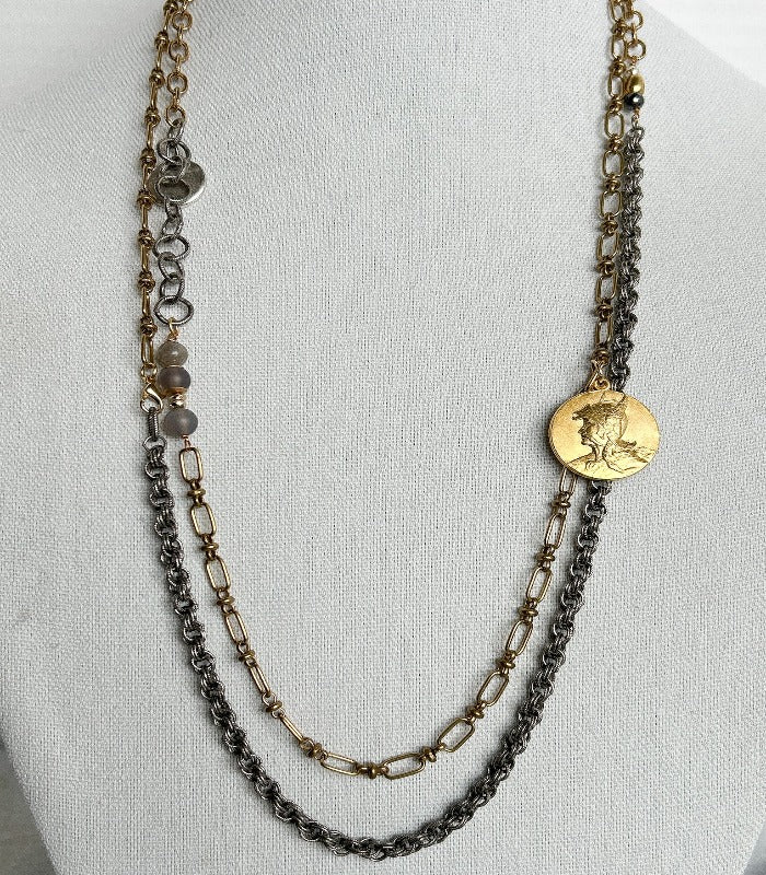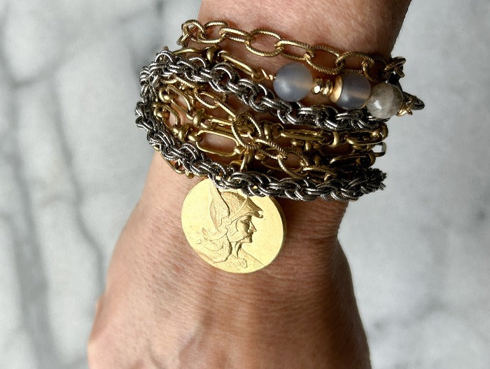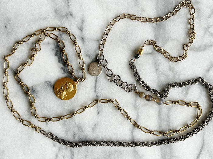 Endless options depending on your mood. A collection of handpicked chains combined to create a long necklace that wraps up to three times. The clasp is arranged so you can wrap it as a bracelet too. You get to decide.