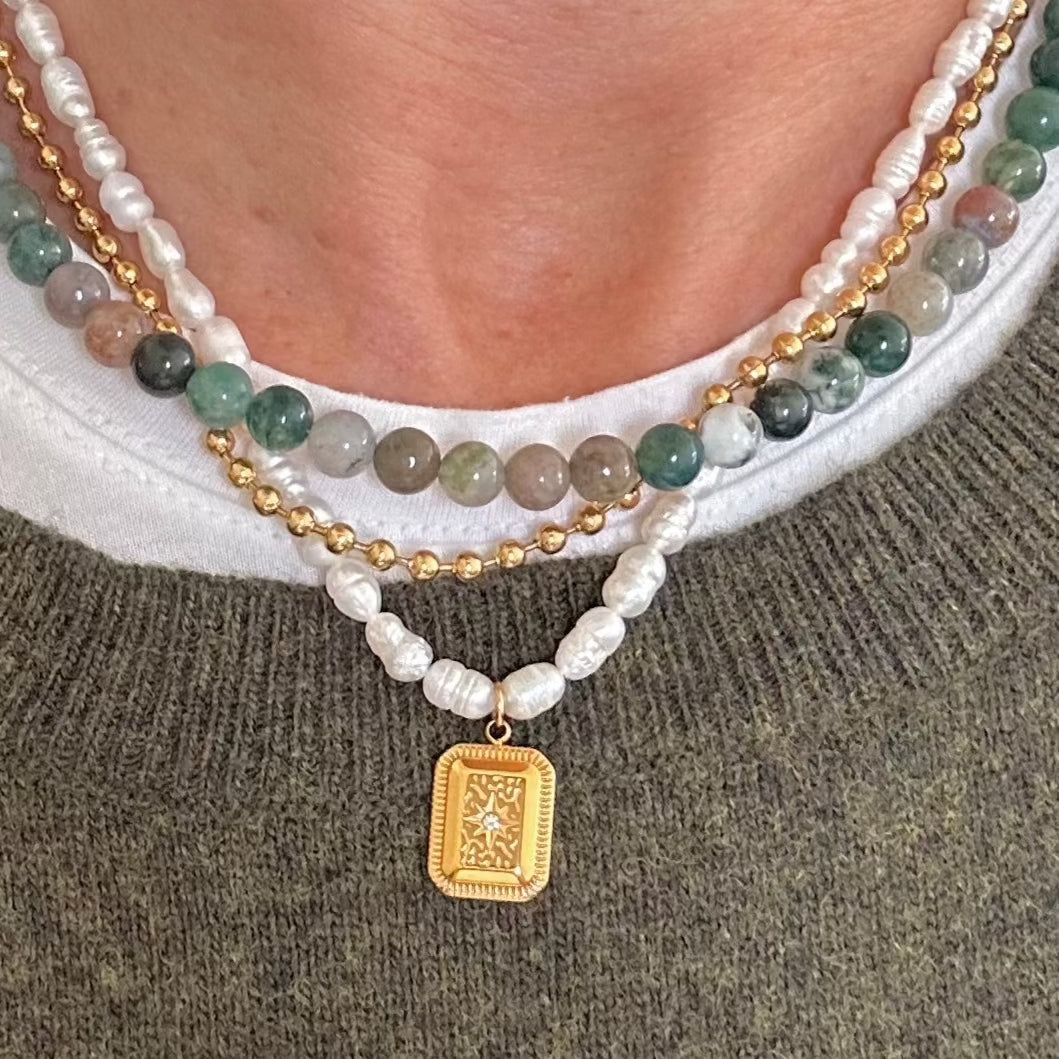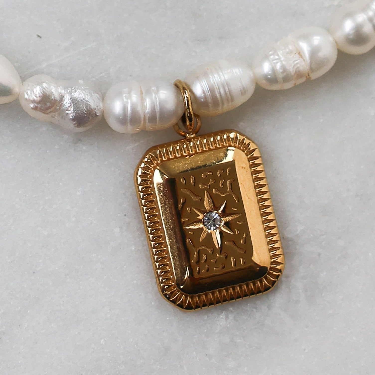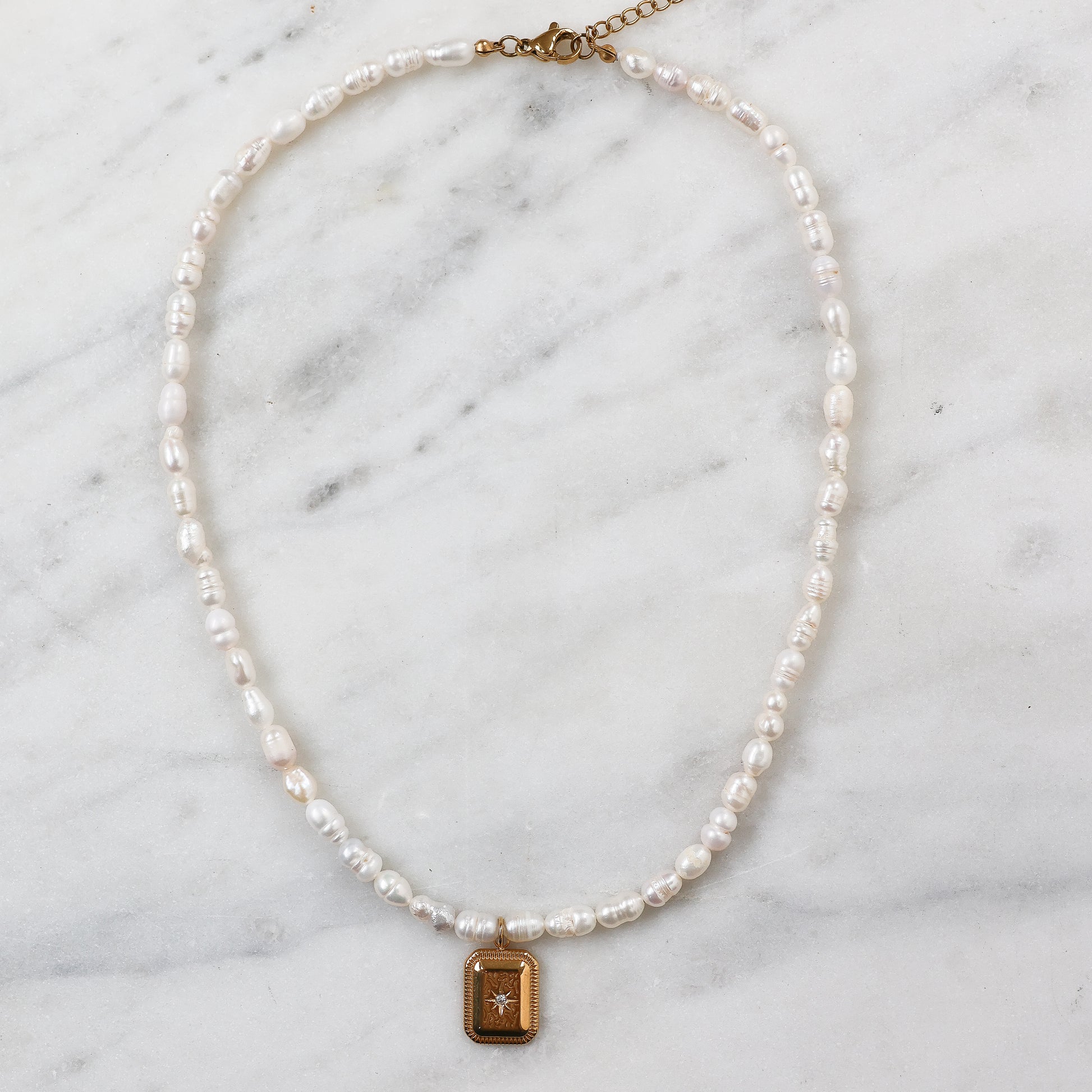 Freshwater pearl with 18K gold pendant. It's a classic look with a nice weight to layer with dainty chains.